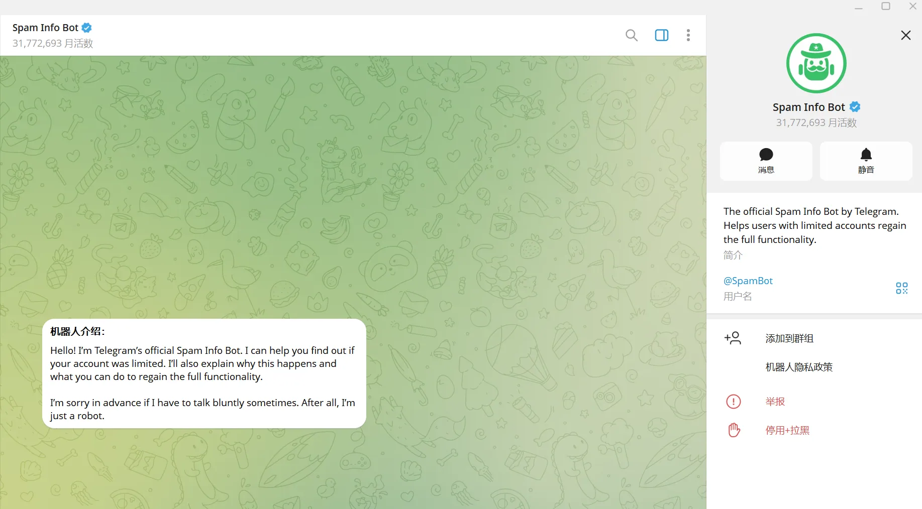 - 直接输入@SpamBot然后回车